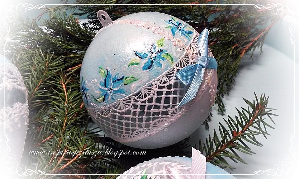 Witam,dziś znów komplecik bombeczek,tym razem w bieli i w niebieskościach.Koronkowo,delikatnie,tak jak lubię.Pierwszy raz zdecydowałam się na zakup bombek z pleksiglasu i farby z efektem szronu,więc są to pierwsze moje takie ozdóbki.